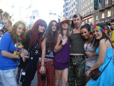 Esta foto es del desfile del orgullo gay en la Gran Vía de Madrid. Una de las góticas hijas de Zapatero hasta lleva un collar con la bandera gay. qué reivindicativas!!